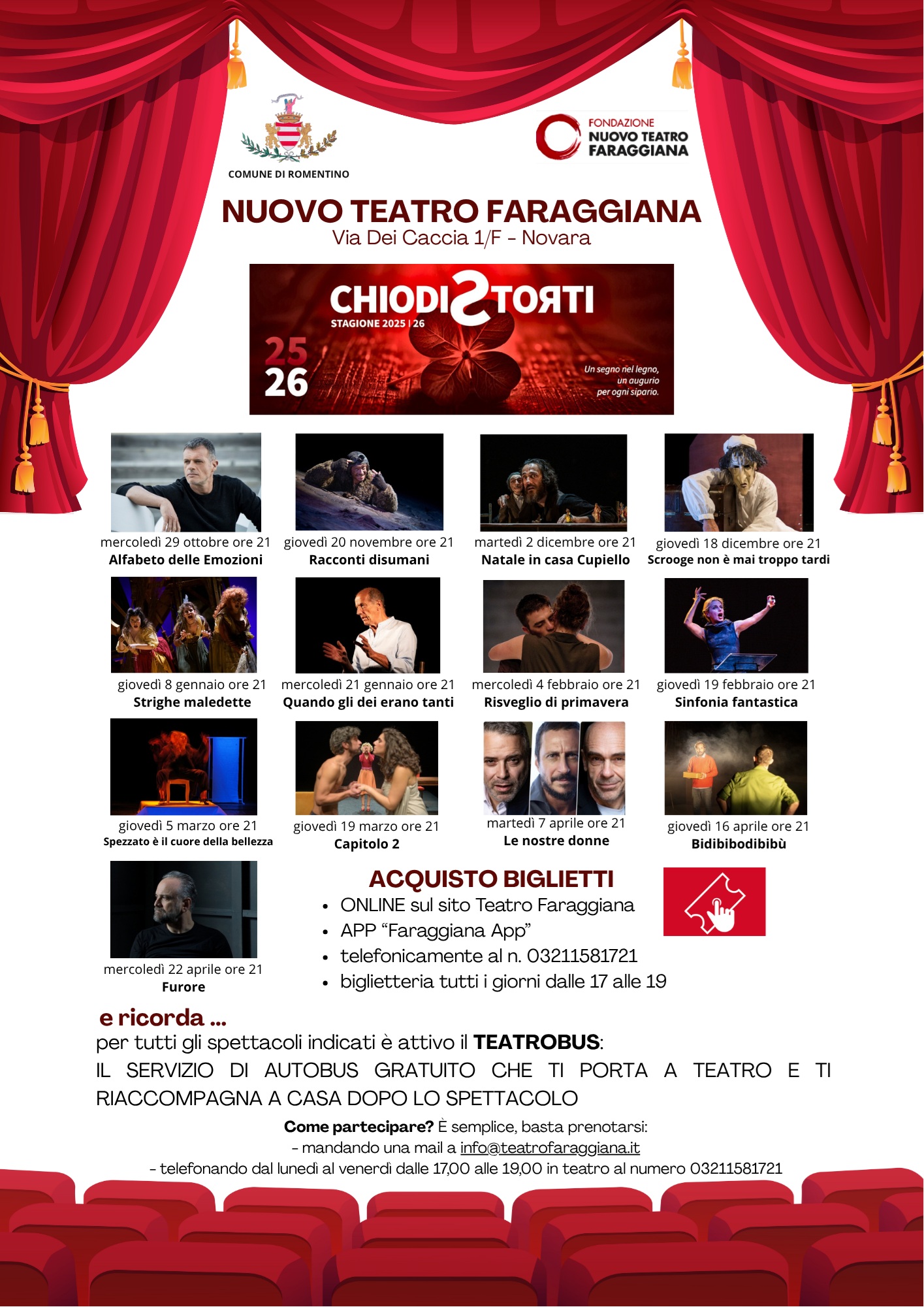 Per tutti gli spettacoli indicati è attivo il TEATROBUS: IL SERVIZIO DI AUTOBUS GRATUITO CHE DA ROMENTINO TI PORTA A TEATRO E TI RIACCOMPAGNA A CASA DOPO LO SPETTACOLO
