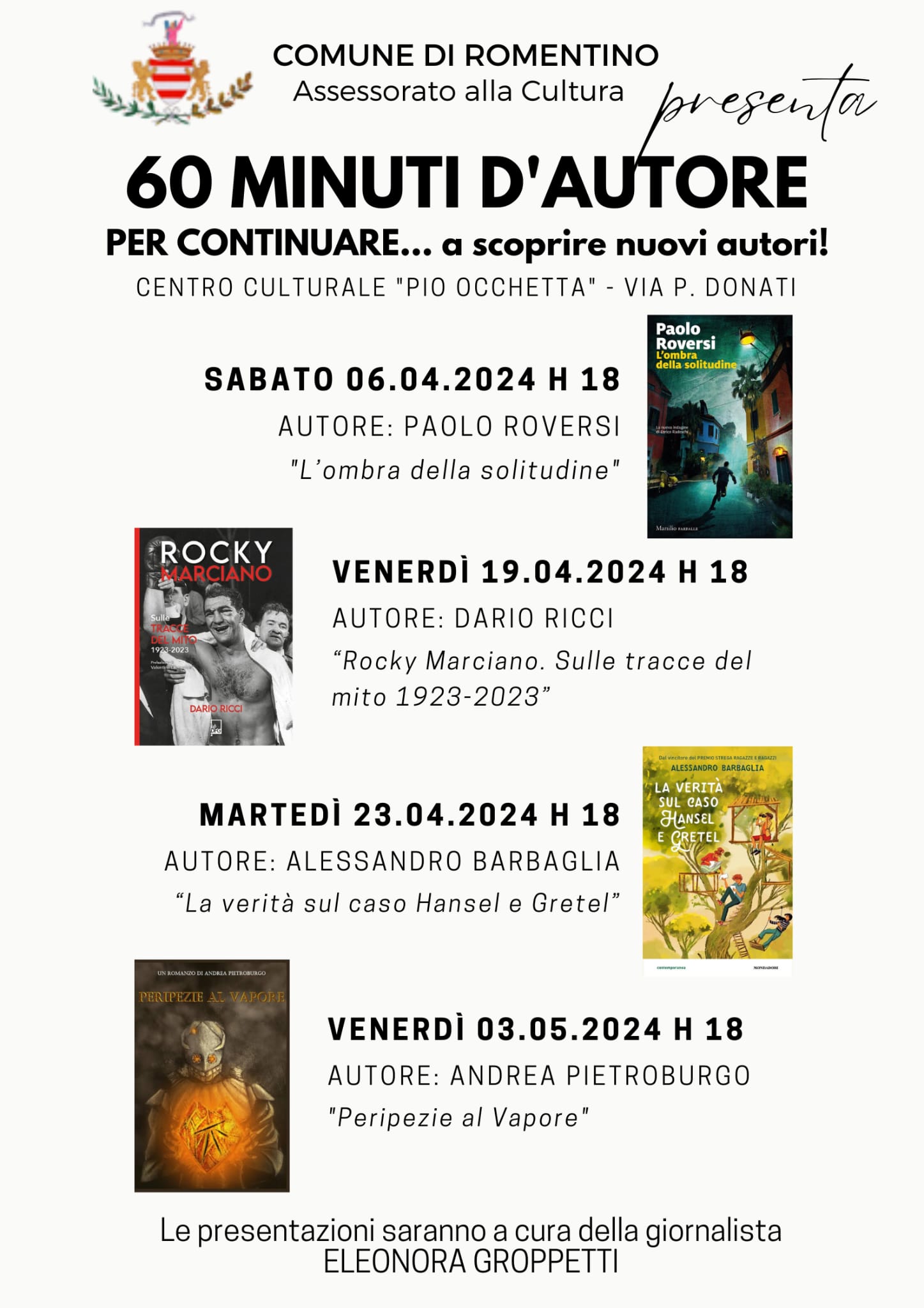 Presso il centro culturale "Arch Pio Occhetta" riprende la rassegna "60 minuti d'autore". La giornalista Eleonora Groppetti presenta in quattro incontri quattro libri.