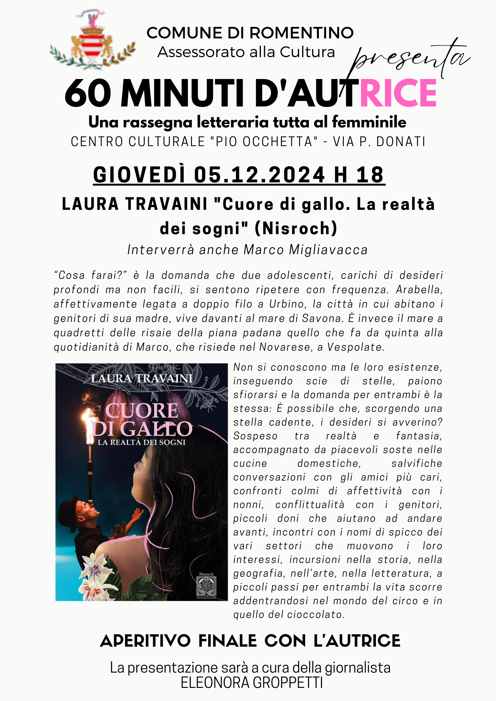 Giovedì 05 dicembre ore 18.00, presso il centro culturale "Arch. Pio Occhetta", Eleonora Groppetti presenta il libro "Cuore di gallo la realtà dei sogni." di Laura Travaini