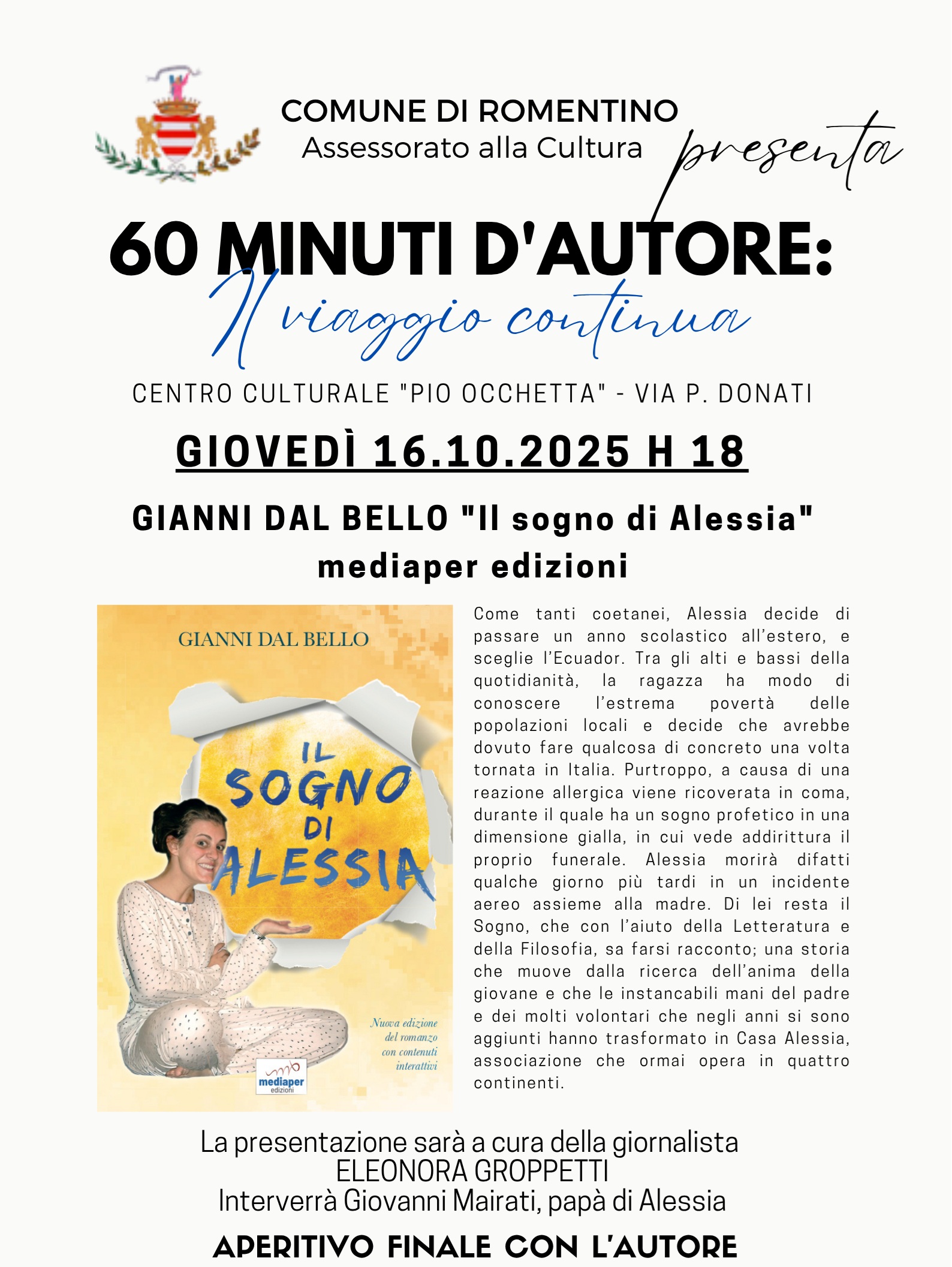L'assessorato alla Cultura del Comune di Romentino è lieta di invitare la cittadinanza, giovedì 16.10.2025 h 18.00, presso il centro culturale "Arch. Pio Occhetta" - via P. Donati, 26 alla presentazione del libro "Il sogno di Alessia" di Gianni Dal Bello edito da Mediaper Edizioni.