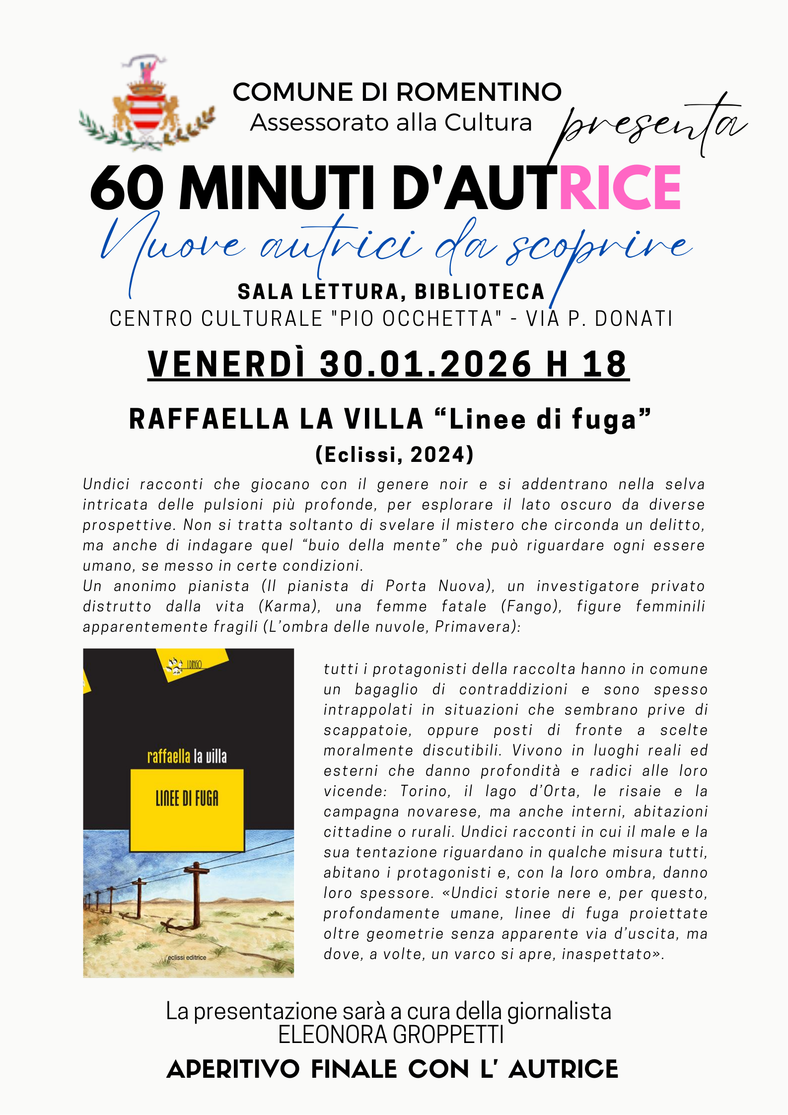 Il Comune di Romentino invita la cittadinanza a partecipare alla presentazione del libro di Raffaella La Villa “Linee di fuga” (eclissi, 2024) presso la sala lettura, biblioteca Centro Culturale "Arch. Pio Occhetta" - via P. Donati venerdì 30.01.2026 h 18