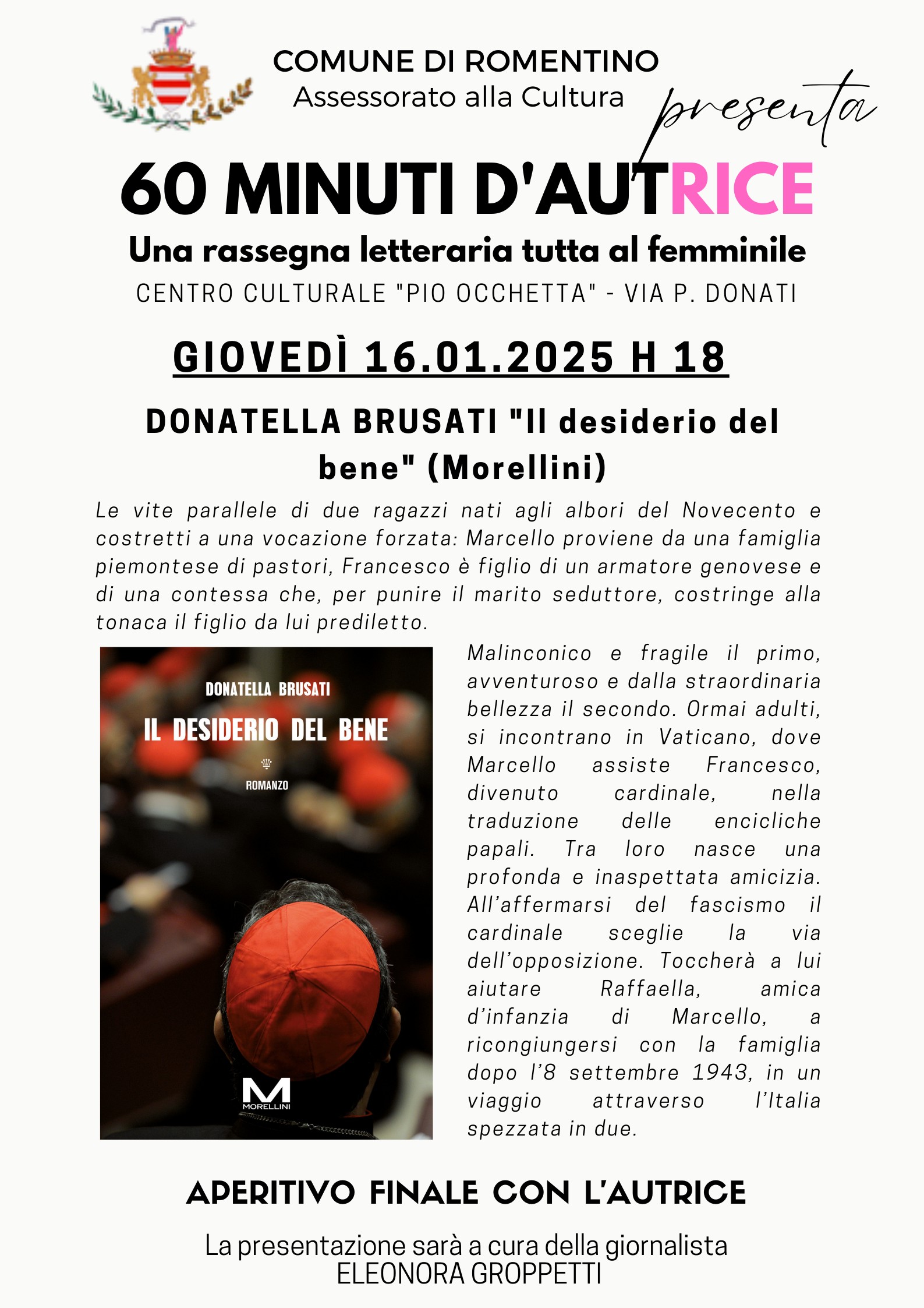 Giovedì 16/01/2025 ore 18.00 presso il centro Culturale "Arch. Pio Occhetta" via Paolo Donati, 26 Eleonora Groppetti presenta il libro: "Il Desiderio del bene" di Donatella Brusati prodotto da "Morellini".