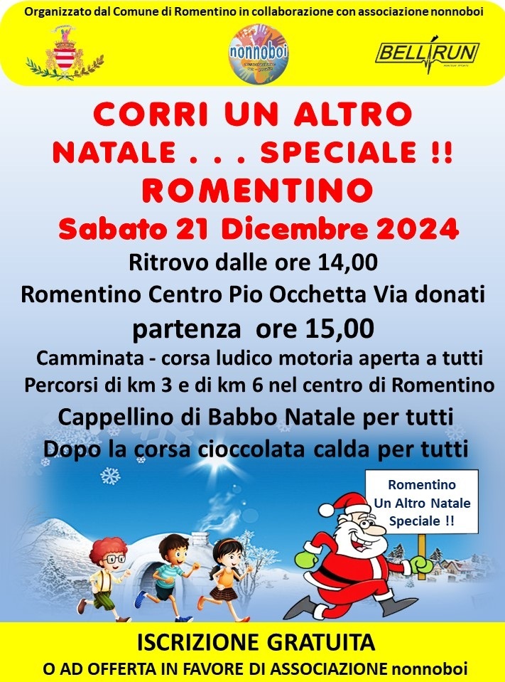 Camminata-corsa ludico motoria aperta a tutti per le vie di Romentino. Percorsi di 3 e 6 km nel Centro di Romentino, cappellino di Natale per tutti ed a seguire cioccolata calda per i presenti!