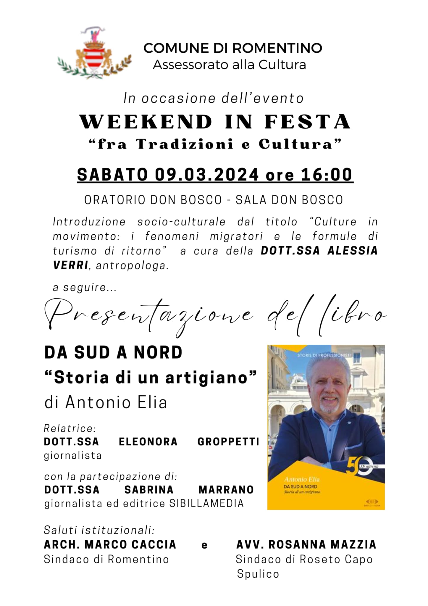 Presentazione del libro "Da sud a nord storia di un artigiano" di Antonio Elia. Ore 16.00 sala Don Bosco Oratorio.