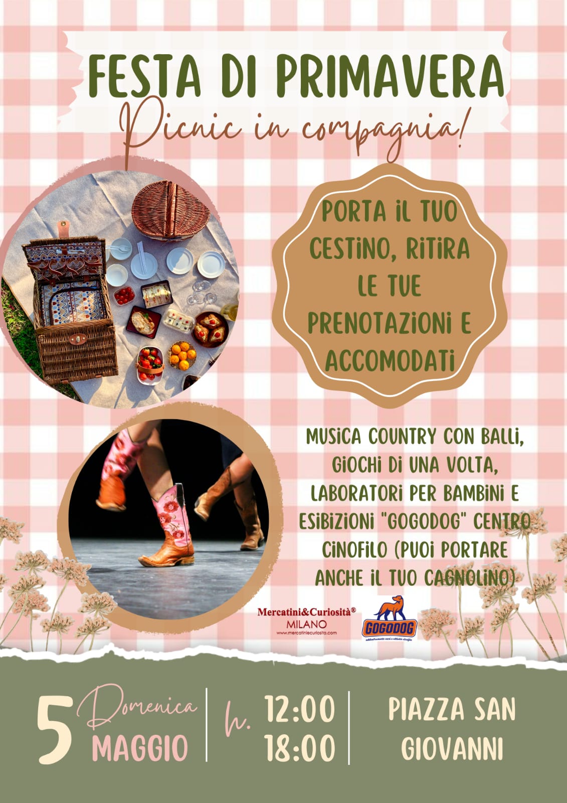 Domenica 5 maggio, dalle ore 12.00 alle ore 18.00, in piazza San Giovanni, picnic in compagnia, musica country giochi per bambini e esibizione del centro cinofilo "Gogodog".