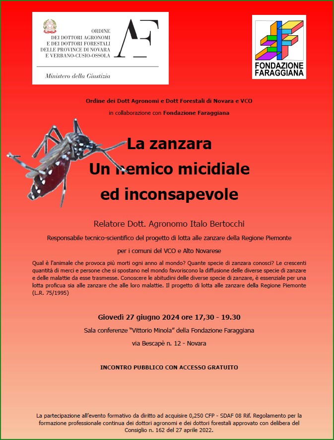 L'Ordine dei Dottori Agronomi e Forestali delle Province di Novara e VCO ha organizzato un incontro aperto a tutti in cui l'agronomo Italo Bertocchi, responsabile tecnico-scientifico del progetto di lotta alle zanzare della Regione Piemonte per i comuni del VCO e dell'Alto Novarese, illustrerà come affrontare la zanzara nella quotidianità per limitare i danni. Ma racconterà anche quante specie di zanzare si trovano oggi nel nostro territorio, come e dove si sviluppano e quali rischi possono dare.