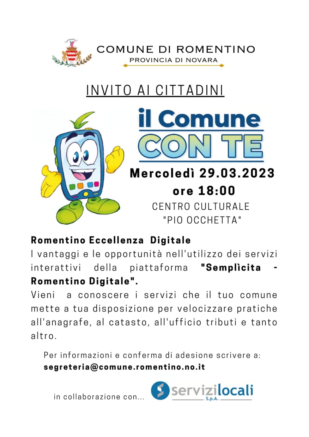 Incontro pubblico che si terrà il giorno Mercoledì 29 Marzo 2023 alle ore 18:00 presso il Centro Culturale "Pio Occhetta" in cui verranno presentati i vantaggi e le opportunità per l'intera comunità romentinese che scaturiscono dall'utilizzo dei servizi interattivi della piattaforma "Romentino Digitale".