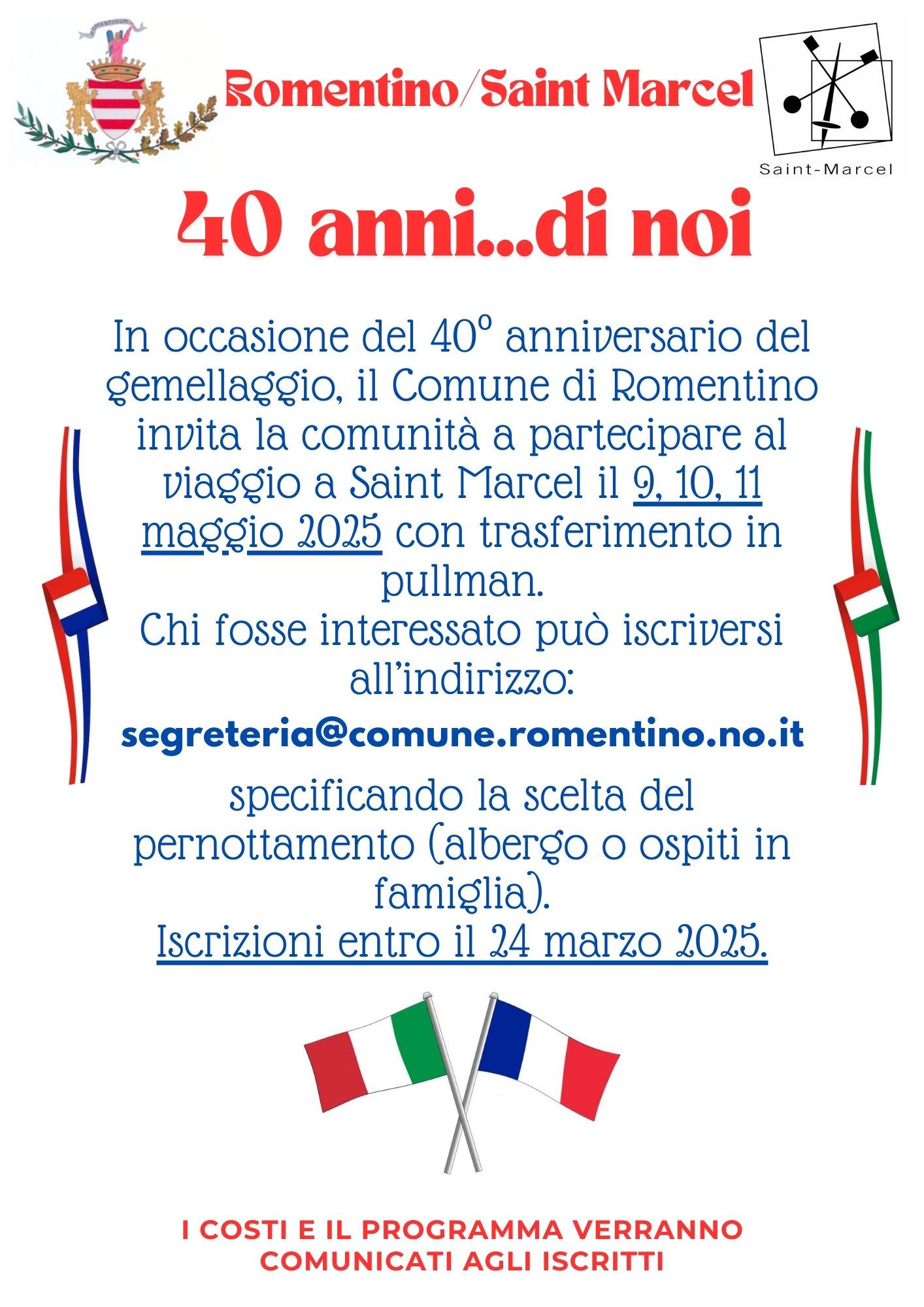 In occasione del 40° anniversario del gemellaggio, il Comune di Romentino invita la comunità a partecipare al viaggio a Saint Marcel il 9, 10, 11 maggio 2025 con trasferimento in pullman.