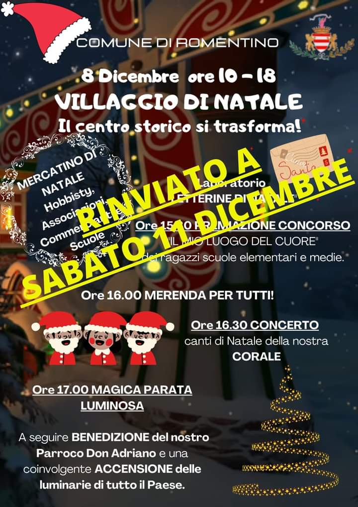 Causa previsto forte maltempo il Villaggio di Natale è stato posticipato al giorno Sabato 11 Dicembre 2021, dalle ore 10:00 alle ore 18:00, sempre presso il centro storico di Romentino.