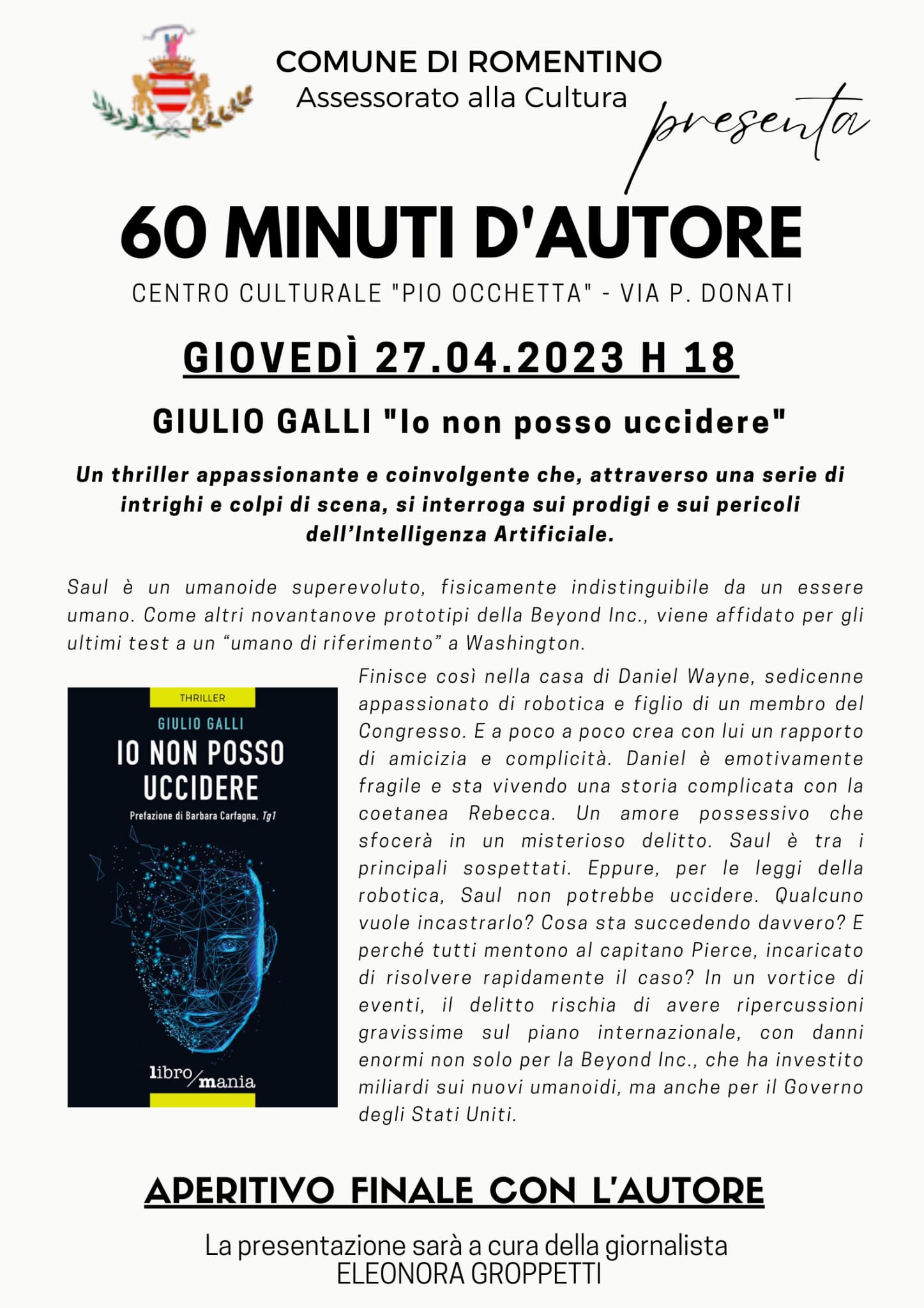 Presentazione libro: "Io non posso uccidere" scritto da "Giulio Galli" c/o Centro "Pio Occhetta" via Donati n°26 ore 18.00. In allegato la locandina.