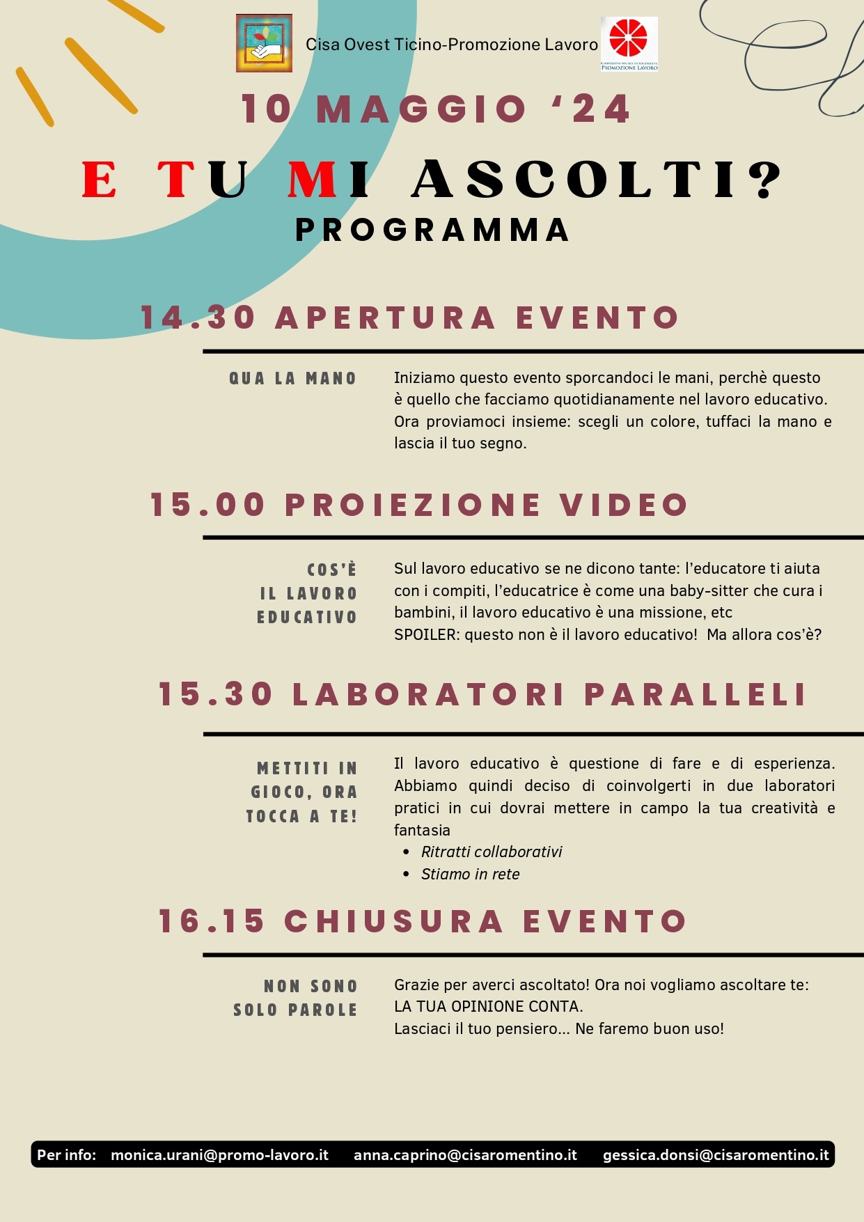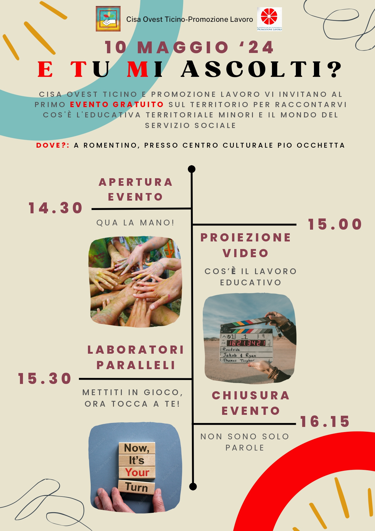 Cisa Ovest Ticino e Promozione Lavoro vi invitano al primo evento gratuito per raccontarvi cos'è l'educativa territoriale minori e il mondo del servizio sociale. Apertura evento ore 14.30 presso il centro "Arch Pio Occhetta" via Donati n°26 a Romentino.