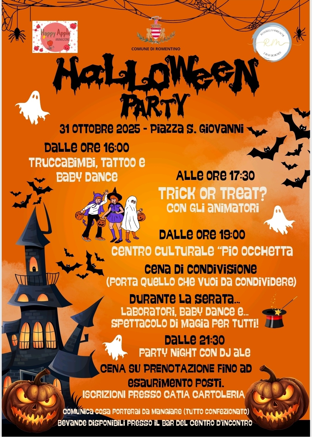 venerdì 31 ottobre 2025 - piazza s. Giovanni dalle ore 16.00 la festa ha inizio con trucca bimbi, tattoo e baby dance; ore 17.30 trick or treat? con gli animatori.