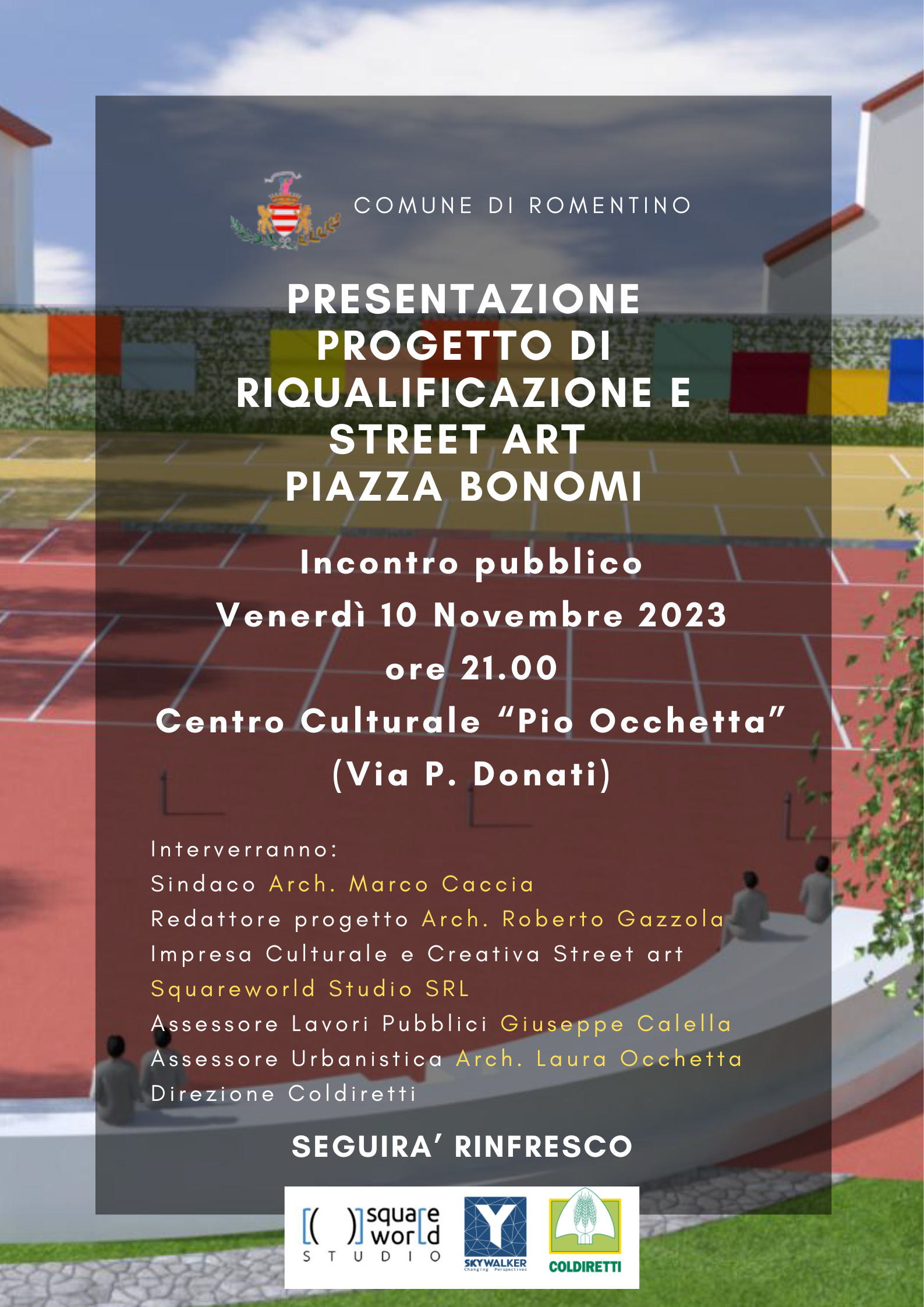 Venerdì 10 novembre 2023 ore 21.00, presso il centro culturale "Pio Occhetta", si terrà un incontro pubblico ove verrà presentato il progetto di riqualificazione della piazza Bonomi.