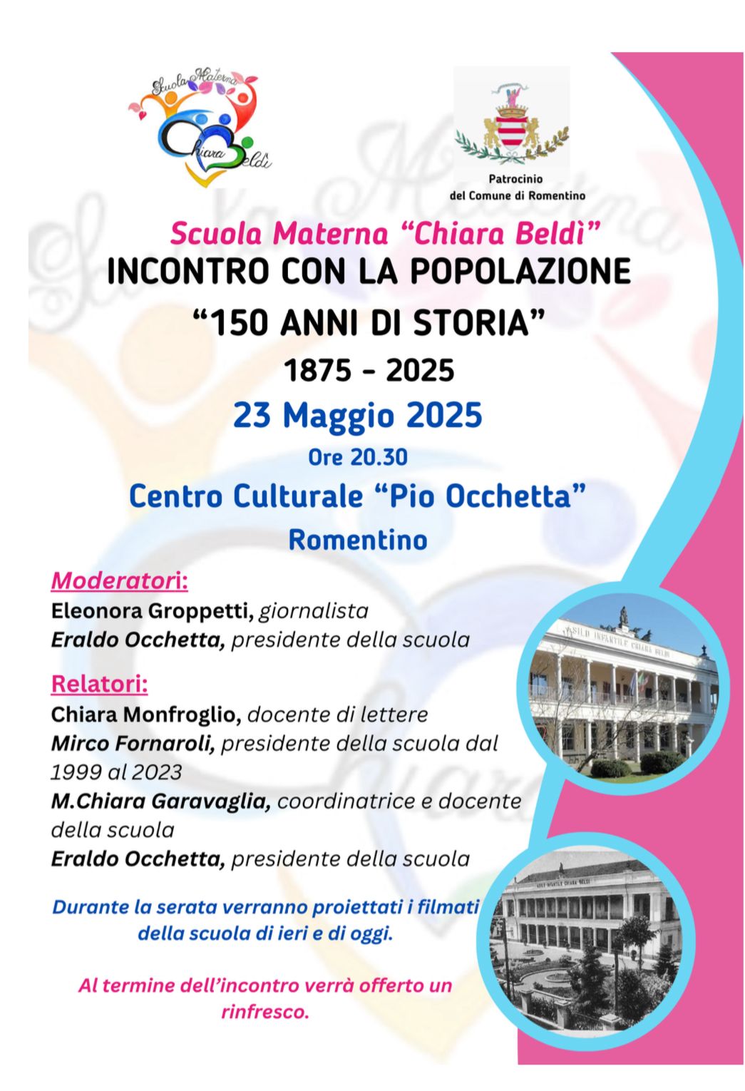 Con il Patrocinio del Comune di Romentino la Scuola Materna “Chiara Beldì”, in occasione del suo 150° anno, è lieta di invitare tutta la popolazione venerdì 23 Maggio 2025 Ore 20.30 presso il Centro Culturale “Arch. Pio Occhetta” via Donati. 26 per ricordare "150 ANNI DI STORIA” 1875 - 2025
