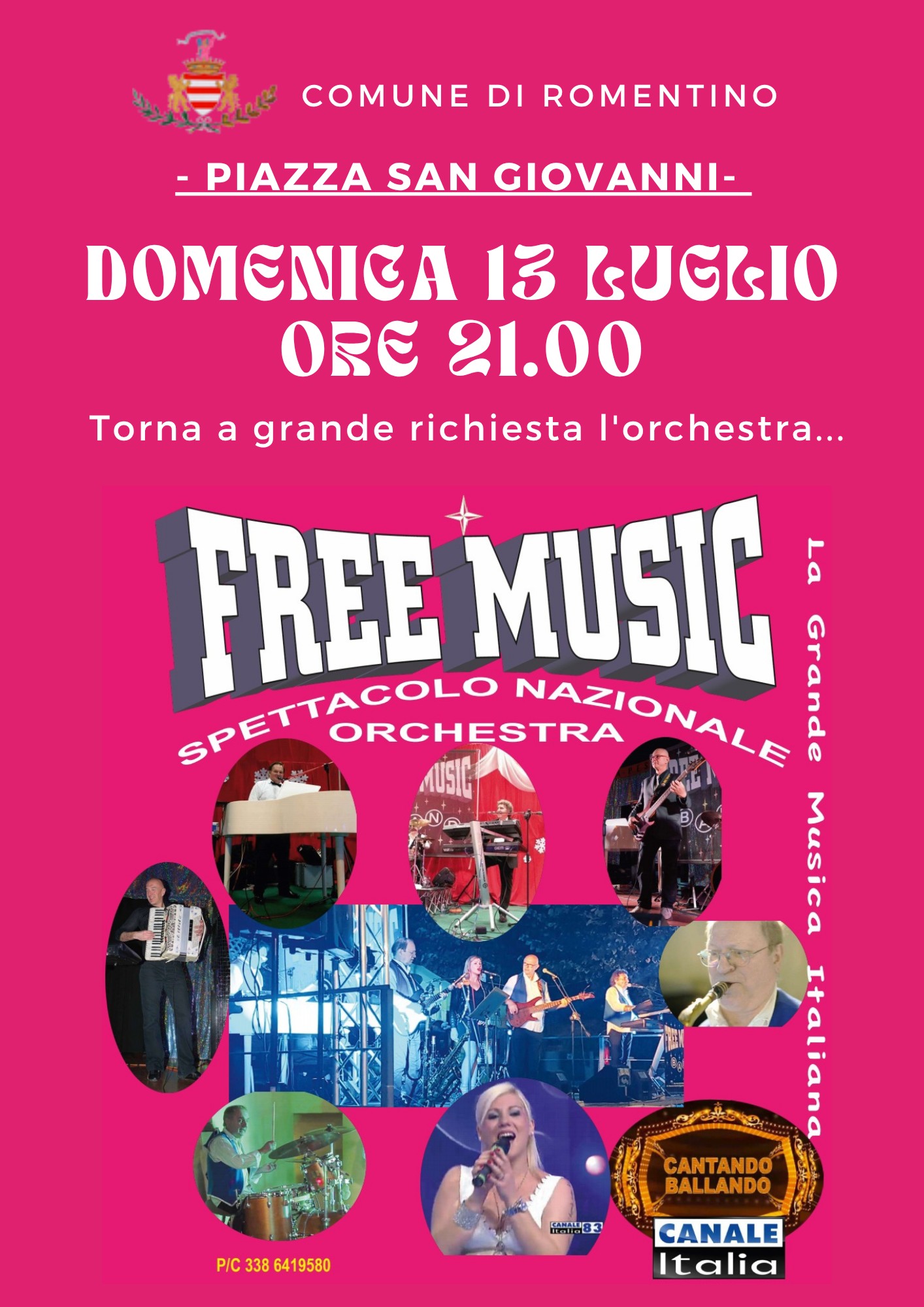 Domenica 13 luglio 2025 ore 21.00, in piazza San Giovanni a Romentino, ritorna lo spettacolo nazionale con l'orchestra "FREE MUSIC".